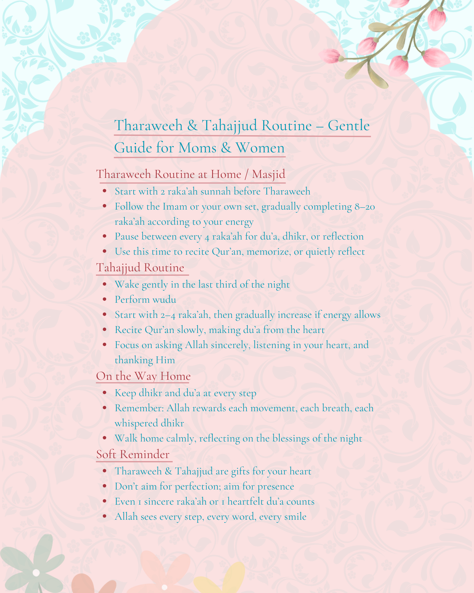 Inside, you’ll find gentle guidance for salah, du’a, dhikr, Qur’an, sadaqah, Laylatul Qadr, Eid preparation, home routines, meal planning, and self-care—all designed to fit real life with family and children.